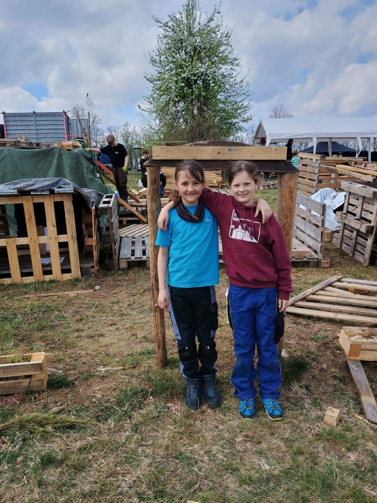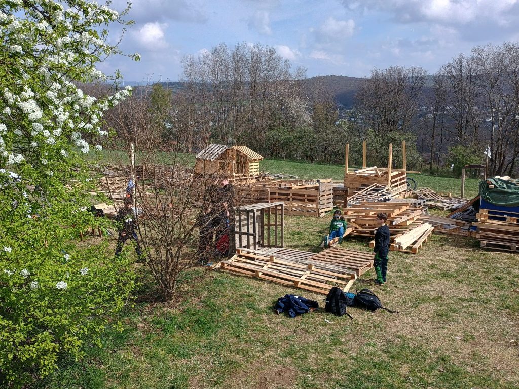 Das Konzept ist so einfach wie genial: Ein riesiger Berg alter Paletten, dazu ausreichend Nägel und Hämmer – mehr braucht es nicht, um die Fantasie zu wecken. Unter freiem Himmel können die Kinder nach Herzenslust hämmern, sägen und konstruieren. In kleinen Gruppen entstehen so Stück für Stück eigene Buden und Verstecke, bis schließlich ein ganzes, buntes „Paletten-Dorf“ auf der Wiese steht.