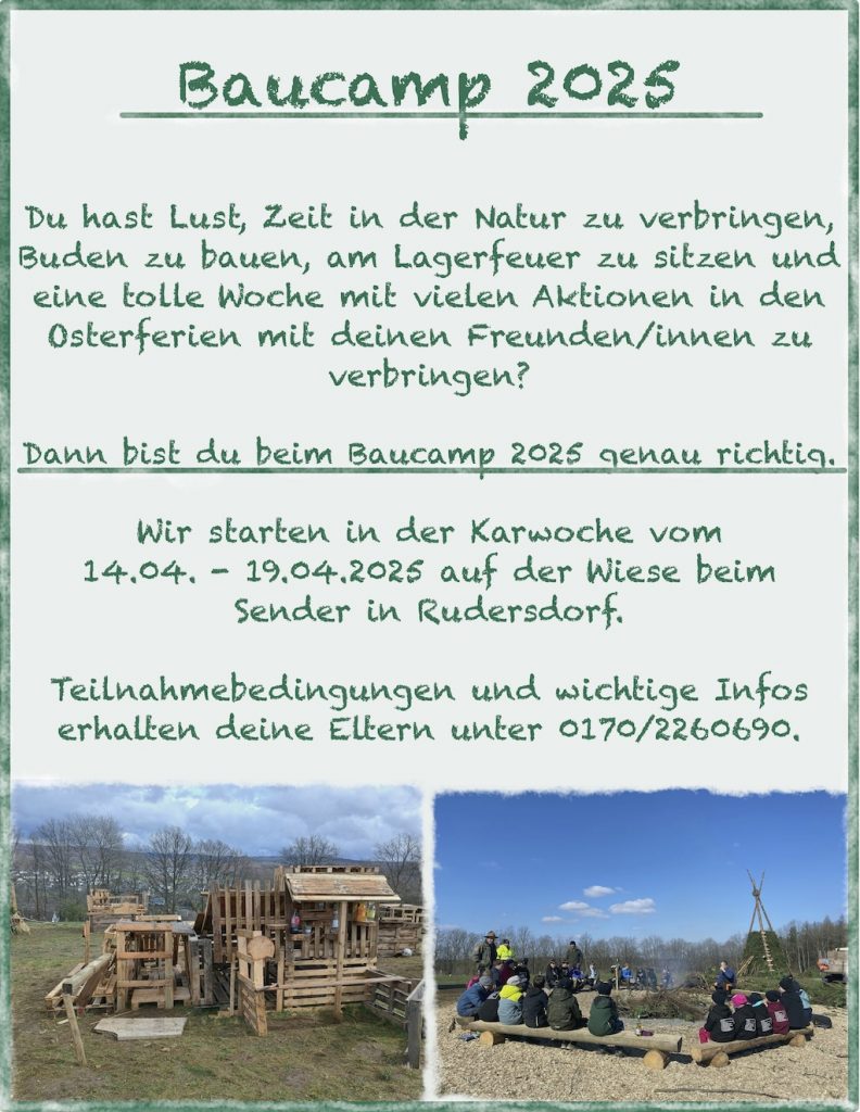 Bist du bereit für das Highlight der Osterferien? Wenn die Tage länger werden und der Frühling in den Startlöchern steht, verwandelt sich die Wiese am Sender in Rudersdorf wieder in eine riesige Freiluft-Werkstatt. Wir laden dich herzlich ein, Teil unserer Bau-Crew zu werden und eine Woche zu erleben, die du so schnell nicht vergessen wirst!
